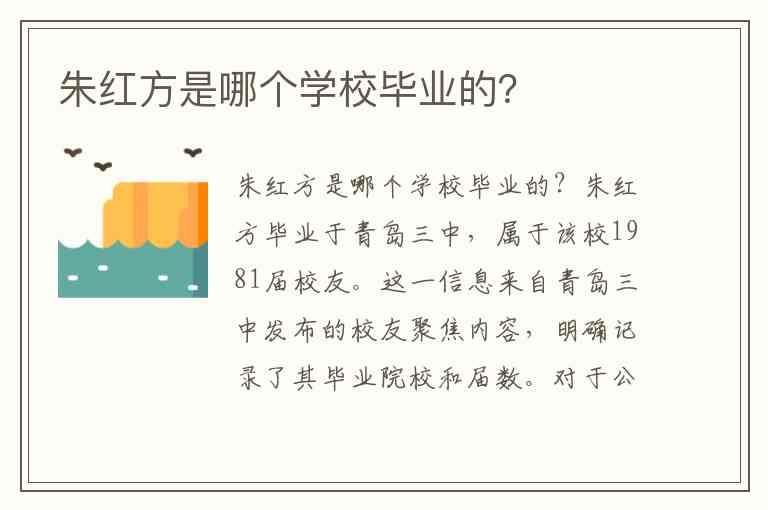 朱红方毕业于青岛三中,属于该校1981届校友。这一信息来自青岛三中发布的校友聚焦内容,明确记录了其毕业院校和届数。对于公众人物的教育背景,学校官方发布的校友信息通常具有较高可信度,为了解其早年学习经历提供了直接依据。