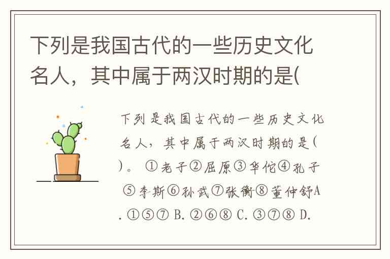 下列是我国古代的一些历史文化名人,其中属于两汉时期的是( )。 ①老子②屈原③华佗④孔子 ⑤李斯⑥孙武⑦张衡⑧董仲舒A.①⑤⑦ B.②⑥⑧ C.③⑦⑧ D.③④⑤