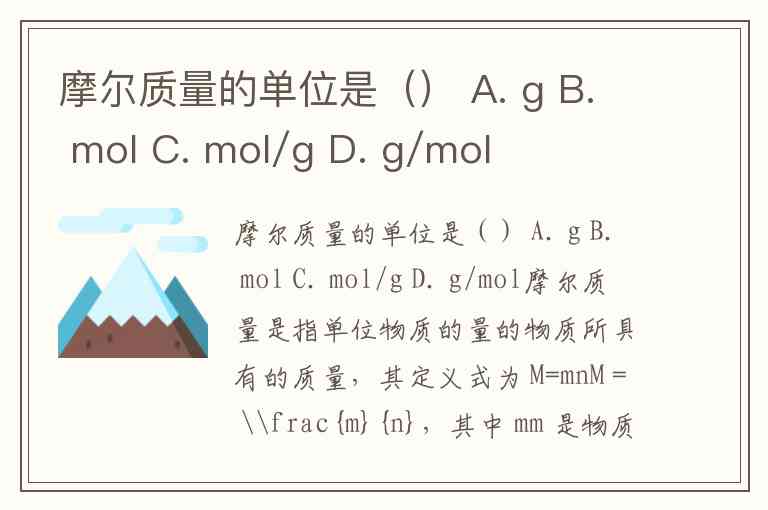 摩尔质量是指单位物质的量的物质所具有的质量,其定义式为 M=mn,其中 m 是物质的质量(单位通常为克,g),n 是物质的量(单位为摩尔,mol)。因此,摩尔质量的单位是克每摩尔,符号为 g/mol。