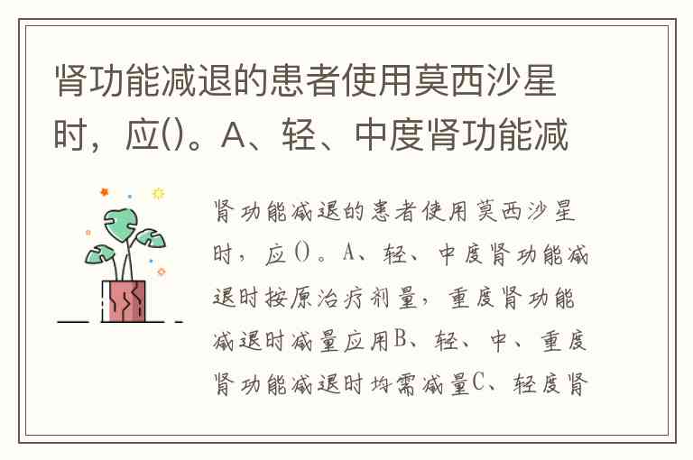肾功能减退的患者使用莫西沙星时,应()。A、轻、中度肾功能减退时按原治疗剂量,重度肾功能减退时减量应用B、轻、中、重度肾功能减退时均需减量C、轻度肾功能减退时按原治疗剂量,中、重度肾功能减退时减量应用D、按原治疗剂量应用E、绝对避免使用