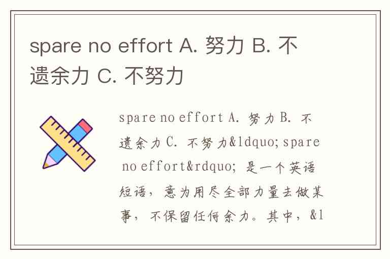 “spare no effort” 是一个英语短语,意为用尽全部力量去做某事,不保留任何余力。其中,“spare” 表示“保留、节省”,“no effort” 表示“不保留努力”,合起来就是全力以赴的意思。