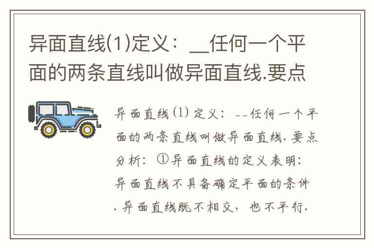 异面直线是空间中既不平行也不相交的两条直线,其核心特征是“不同在任何一个平面内”。这意味着无论如何延展,它们都不会共面,也没有公共交点——就像桌面上的一支水平铅笔和桌腿边缘的铅垂线,无论怎样延伸都不会相交或平行。