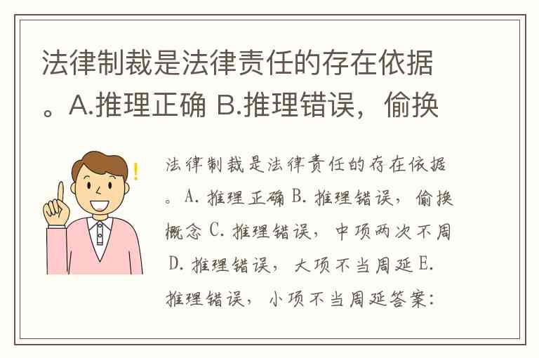 法律制裁是法律责任的存在依据。A.推理正确 B.推理错误,偷换概念 C.推理错误,中项两次不周 D.推理错误,大项不当周延 E.推理错误,小项不当周延