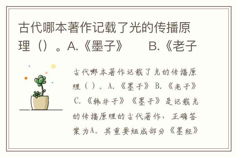 古代哪本著作记载了光的传播原理()。A.《墨子》 B.《老子》 C.《韩非子》