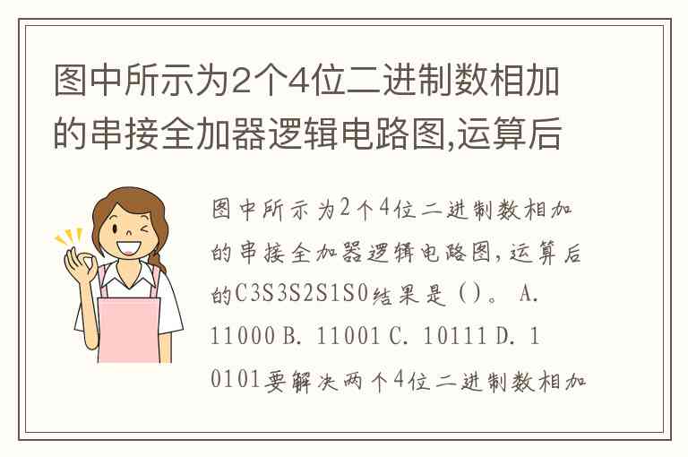 图中所示为2个4位二进制数相加的串接全加器逻辑电路图,运算后的C3S3S2S1S0结果是 ( )。 A. 11000 B. 11001 C. 10111 D. 10101