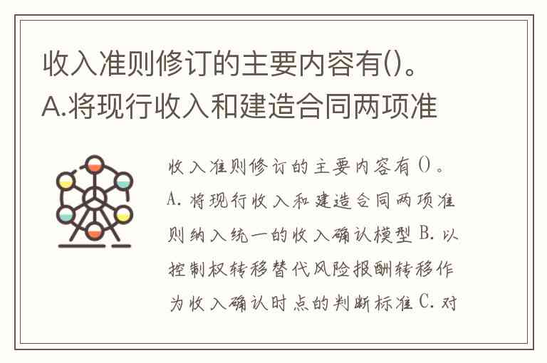 收入准则修订的核心是构建以合同为基础、以控制权转移为判断标准的统一框架,主要内容包括四个方面。A项正确,新准则将原收入准则和建造合同准则合并为单一模型,解决了类似交易因准则边界模糊导致的处理差异,例如建筑企业的工程合同与制造业的销售合同将采用一致的确认逻辑。