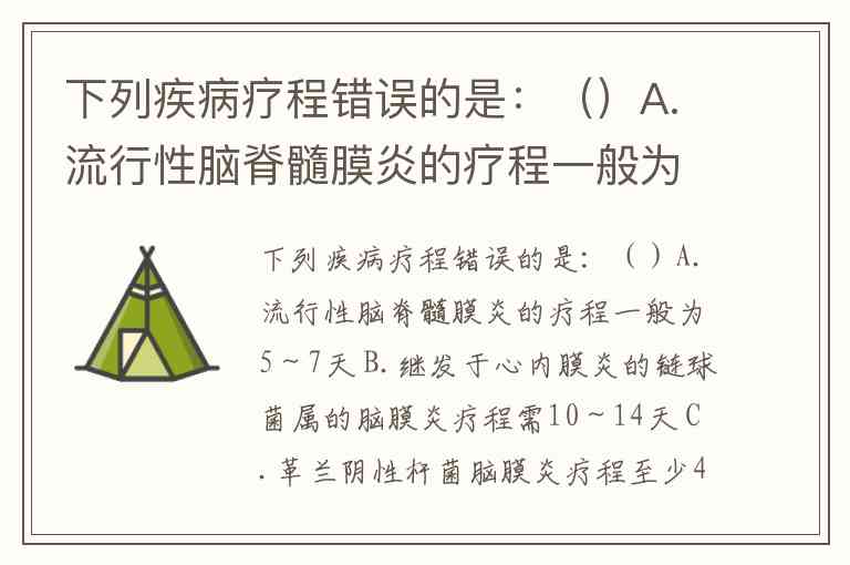 下列疾病疗程错误的是:()A.流行性脑脊髓膜炎的疗程一般为5~7天 B.继发于心内膜炎的链球菌属的脑膜炎疗程需10~14天 C.革兰阴性杆菌脑膜炎疗程至少4周 D.肺炎链球菌脑膜炎在体温恢复正常后继续用药10~14天