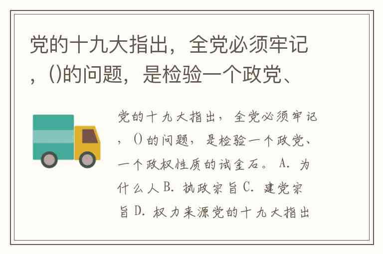 党的十九大指出,全党必须牢记,()的问题,是检验一个政党、一个政权性质的试金石。 A. 为什么人 B. 执政宗旨 C. 建党宗旨 D. 权力来源