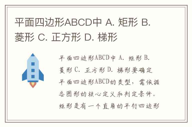 要确定平面四边形ABCD的类型,需依据各图形的核心定义和判定条件。矩形是有一个直角的平行四边形或对角线相等的平行四边形;菱形需满足四边相等或对角线垂直的平行四边形;正方形是特殊的菱形(有一个直角)或矩形(邻边相等);梯形则仅有一组对边平行且另一组不平行。