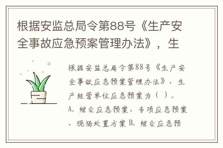 根据安监总局令第88号《生产安全事故应急预案管理办法》,生产经营单位应急预案为( )。 A. 综合应急预案、专项应急预案、现场处置方案 B. 综合应急预案、专项应急预案、应急处置措施 C. 综合应急机制、专项应急机制、应急处置程序 D. 综合应急机制、专项应急机制、应急处置卡片