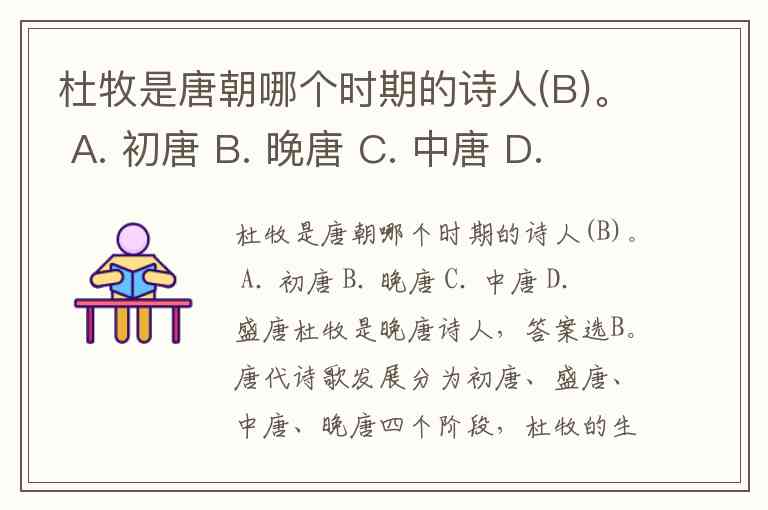 杜牧是唐朝哪个时期的诗人(B)。 A. 初唐 B. 晚唐 C. 中唐 D. 盛唐