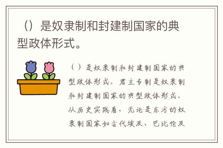 君主专制是奴隶制和封建制国家的典型政体形式。从历史实践看,无论是东方的奴隶制国家如古代埃及、巴比伦及中国夏商周,还是封建制国家的主要政权组织形式,都以君主专制为核心特征,国家最高权力集中于世袭君主一人,其地位凌驾于法律和一切机构之上。