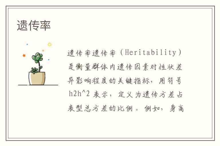 广义遗传率:包含所有遗传效应(加性、显性、上位性),公式为 ( 为总遗传方差, 为表型方差)。