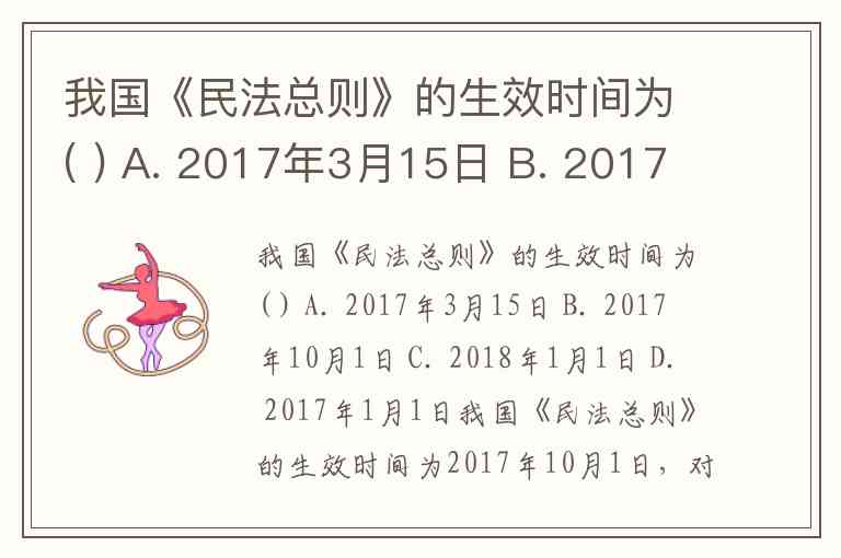 我国《民法总则》的生效时间为( ) A. 2017年3月15日 B. 2017年10月1日 C. 2018年1月1日 D. 2017年1月1日
