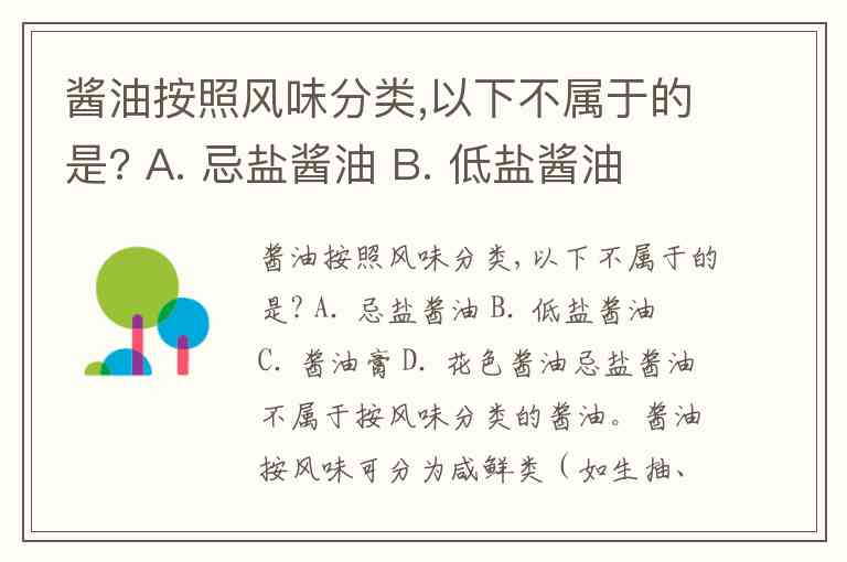 酱油按照风味分类,以下不属于的是? A. 忌盐酱油 B. 低盐酱油 C. 酱油膏 D. 花色酱油