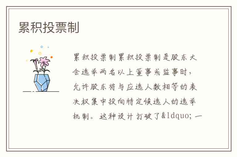 累积投票制是股东大会选举两名以上董事或监事时,允许股东将与应选人数相等的表决权集中投向特定候选人的选举机制。这种设计打破了“一股一票”的绝对控制权逻辑——当选举5名董事时,持有100股的股东可获得500票(100×5),既可以全部投给一名候选人,也可分散投给多人。格力电器2025年董事选举中,有股东因持有1亿股而获得5亿票选举权,最终董明珠得票率超过100%,正是这一机制的典型表现。