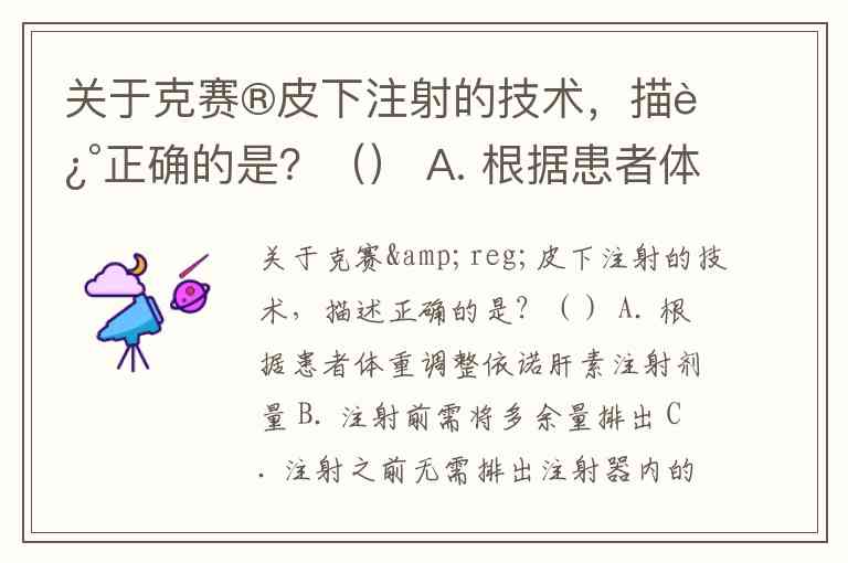 克赛®(通用名依诺肝素钠)作为临床常用抗凝药物,其皮下注射技术需严格遵循特定规范以确保疗效和安全性。根据预填充注射器的设计特点和操作指南,选项A、C描述正确,B错误,故正确答案应为AC。以下从剂量调整、排气操作两方面具体解析: