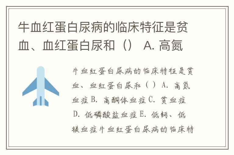 牛血红蛋白尿病的临床特征是贫血、血红蛋白尿和() A. 高氮血症 B. 高酮体血症 C. 贫血症 D. 低磷酸盐血症 E. 低钙、低镁血症