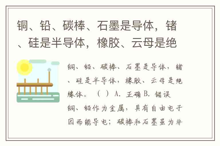 铜、铅、碳棒、石墨是导体,锗、硅是半导体,橡胶、云母是绝缘体。 ( ) A. 正确 B. 错误