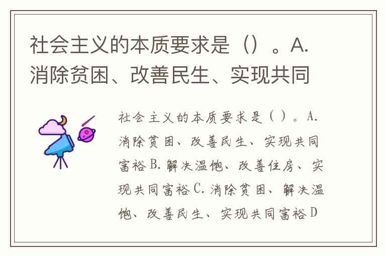 社会主义的本质要求是()。A.消除贫困、改善民生、实现共同富裕 B.解决温饱、改善住房、实现共同富裕 C.消除贫困、解决温饱、改善民生、实现共同富裕 D.消除贫困、解决温饱、改善住房、实现共同富裕