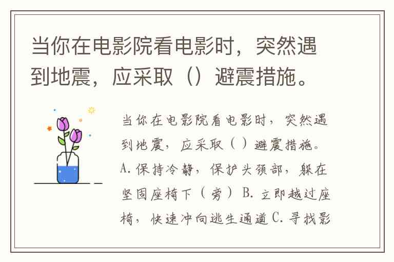 当你在电影院看电影时,突然遇到地震,应采取()避震措施。A.保持冷静,保护头颈部,躲在坚固座椅下(旁) B.立即越过座椅,快速冲向逃生通道 C.寻找影院管理人员,问问看该怎么做 D.冲向食品柜台取食品