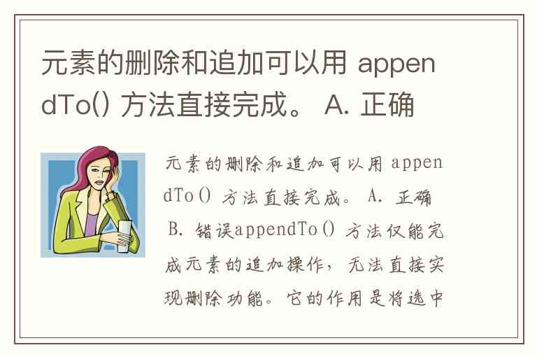 appendTo() 方法仅能完成元素的追加操作,无法直接实现删除功能。它的作用是将选中的元素移动(或复制,取决于情况)到目标位置,原位置的元素会被移除,但这是追加过程的副作用,而非主动的删除操作。若需显式删除元素,需使用 .remove() 等专门方法。因此,题目中“删除和追加可以用 appendTo() 直接完成”的说法不准确。