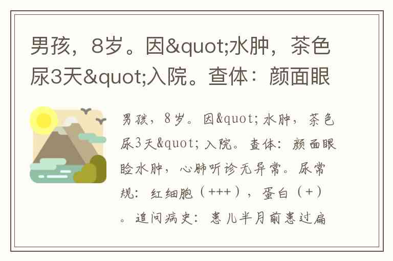 8岁男孩出现水肿、茶色尿3天,半月前有扁桃体炎病史,尿常规提示红细胞(+++)、蛋白(+),这些表现高度符合急性链球菌感染后肾小球肾炎的临床特征。这种疾病典型特点是在链球菌感染(如扁桃体炎)后1-3周出现血尿、蛋白尿、水肿等肾炎综合征表现。