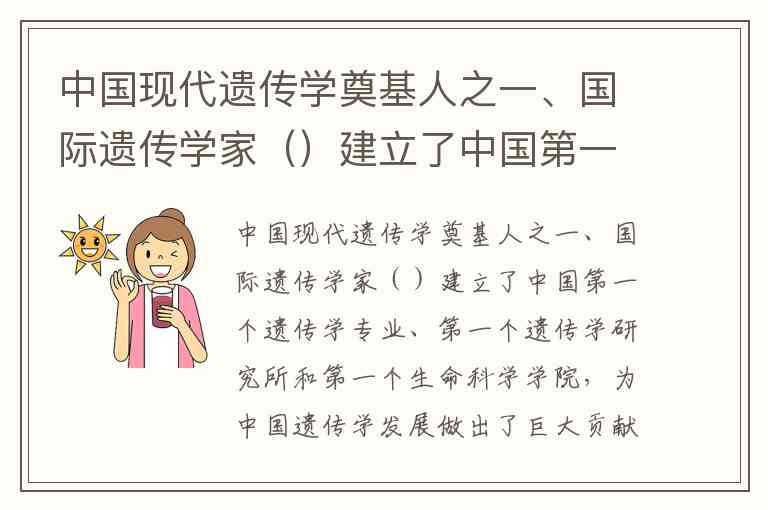 中国现代遗传学奠基人之一、国际遗传学家()建立了中国第一个遗传学专业、第一个遗传学研究所和第一个生命科学学院,为中国遗传学发展做出了巨大贡献。A.童第周 B.谈家桢 C.方液仙 D.董浩云