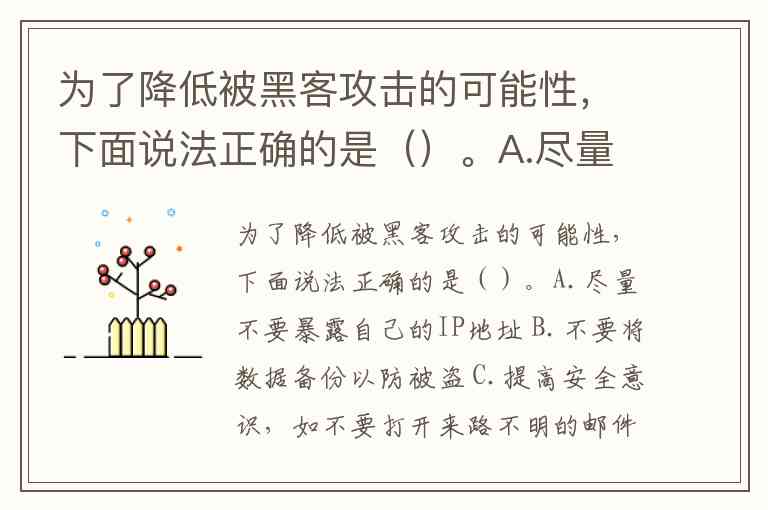 降低黑客攻击风险需要技术防护与安全意识的双重结合。正确选项为A、C、D、E,而B选项“不要将数据备份以防被盗”存在严重误导,定期备份反而是应对攻击的关键措施。