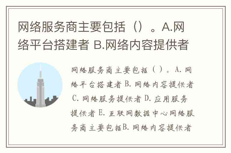 网络服务商主要包括B.网络内容提供者、C.网络服务提供者、D.应用服务提供者和E.互联网数据中心,而A.网络平台搭建者通常属于技术服务范畴,不构成独立分类。以下是具体分析: