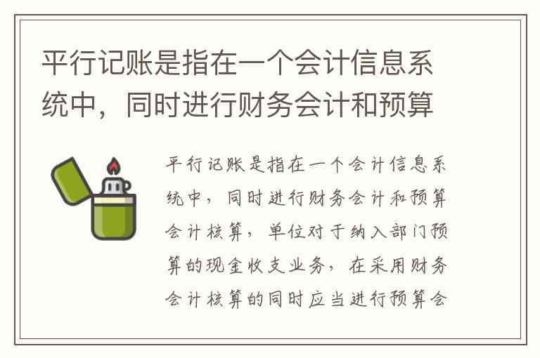 平行记账是指在一个会计信息系统中,同时进行财务会计和预算会计核算,单位对于纳入部门预算的现金收支业务,在采用财务会计核算的同时应当进行预算会计核算。