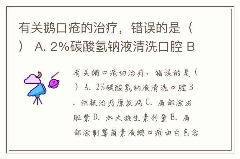 有关鹅口疮的治疗,错误的是() A. 2%碳酸氢钠液清洗口腔 B. 积极治疗原发病 C. 局部涂龙胆紫 D. 加大抗生素剂量 E. 局部涂制霉菌素液
