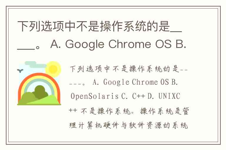 下列选项中不是操作系统的是_____。 A. Google Chrome OS B. OpenSolaris C. C++ D. UNIX