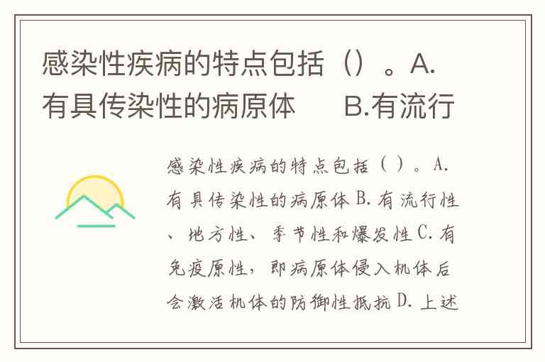 感染性疾病的特点包括()。A.有具传染性的病原体 B.有流行性、地方性、季节性和爆发性 C.有免疫原性,即病原体侵入机体后会激活机体的防御性抵抗 D.上述各项