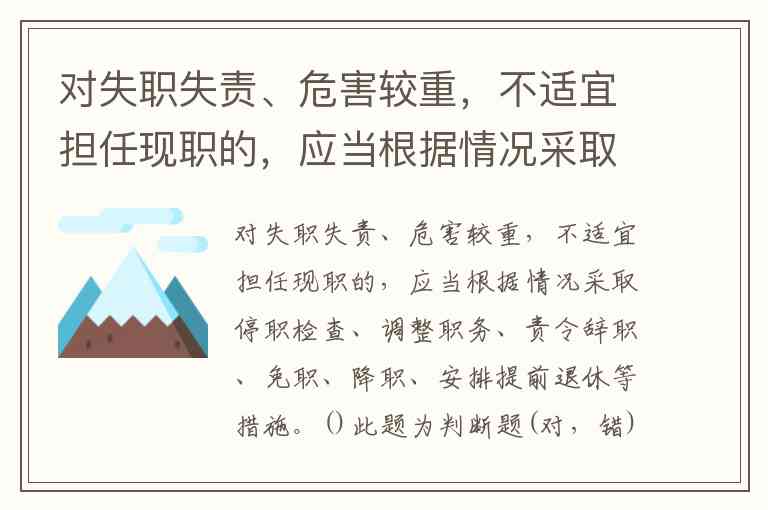 对失职失责、危害较重,不适宜担任现职的,应当根据情况采取停职检查、调整职务、责令辞职、免职、降职、安排提前退休等措施。()此题为判断题(对,错)。