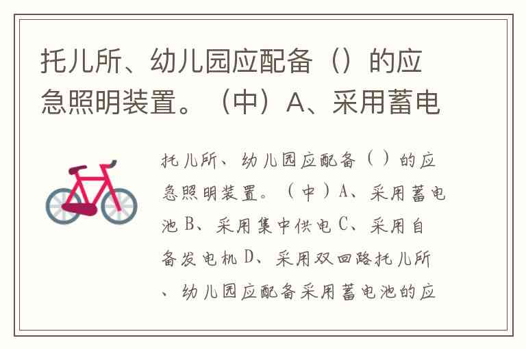 托儿所、幼儿园应配备()的应急照明装置。(中)A、采用蓄电池 B、采用集中供电 C、采用自备发电机 D、采用双回路