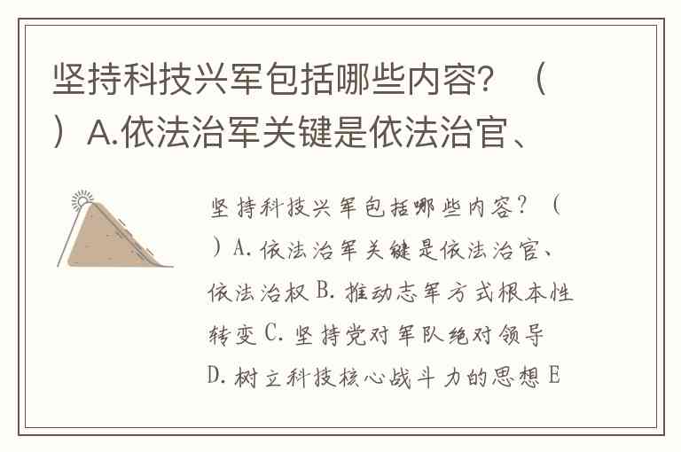 坚持科技兴军包括哪些内容?()A.依法治军关键是依法治官、依法治权 B.推动志军方式根本性转变 C.坚持党对军队绝对领导 D.树立科技核心战斗力的思想 E.推进重大科技创新、自主创新
