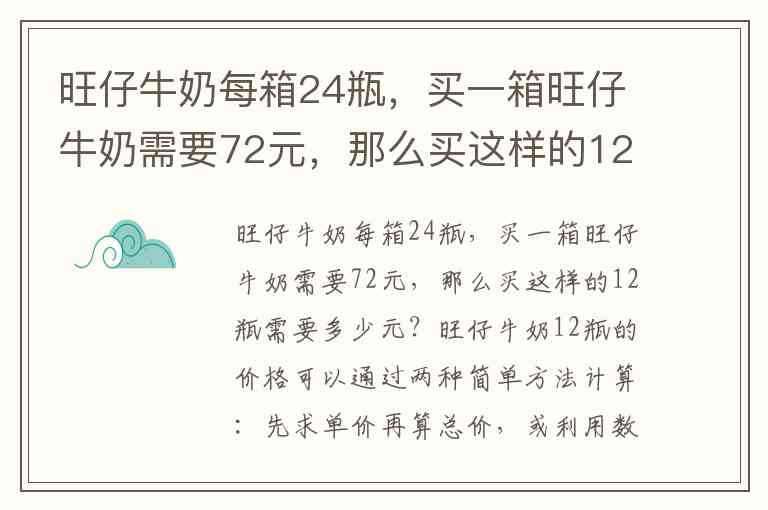 旺仔牛奶12瓶的价格可以通过两种简单方法计算:先求单价再算总价,或利用数量比例直接推导。已知24瓶72元,12瓶恰好是24瓶的一半,因此价格也为72元的一半,即36元。