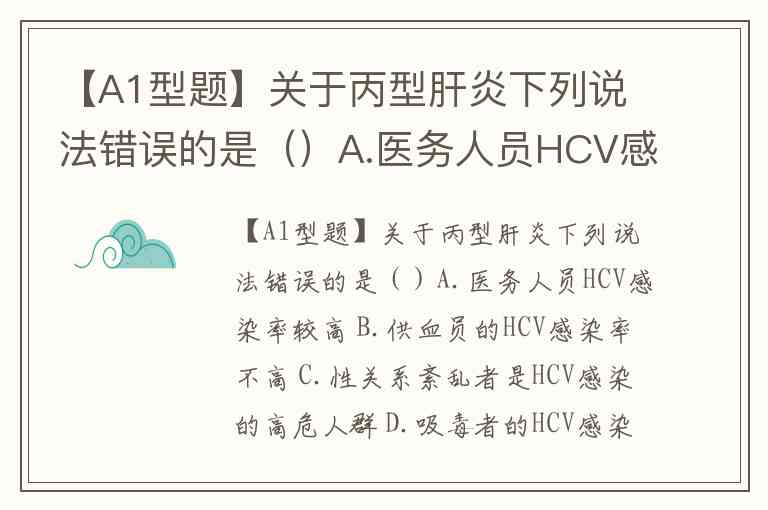 【A1型题】关于丙型肝炎下列说法错误的是()A.医务人员HCV感染率较高 B.供血员的HCV感染率不高 C.性关系紊乱者是HCV感染的高危人群 D.吸毒者的HCV感染方式是经血传播 E.HCV可经母婴传播使其婴儿感染