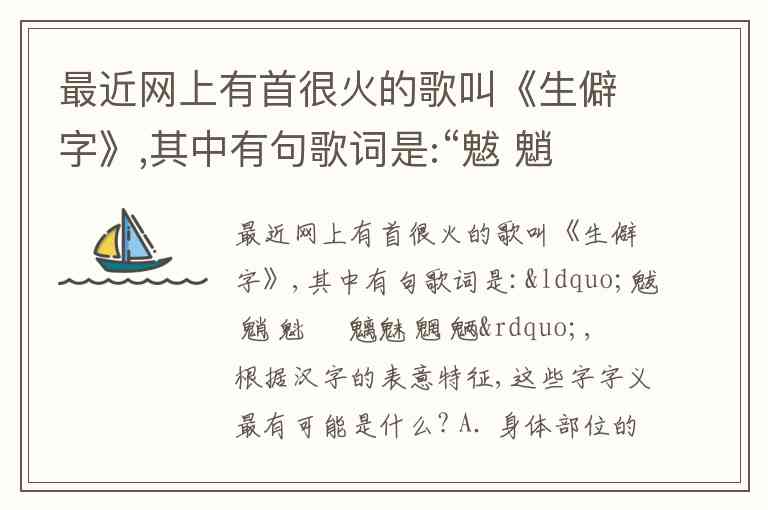 最近网上有首很火的歌叫《生僻字》,其中有句歌词是:“魃 魈 魁 鬾 魑魅 魍 魉”,根据汉字的表意特征,这些字字义最有可能是什么? A. 身体部位的称呼 B. 稀奇 珍宝的名称 C. 一些植物的名称 D. 古人对鬼、怪的称呼