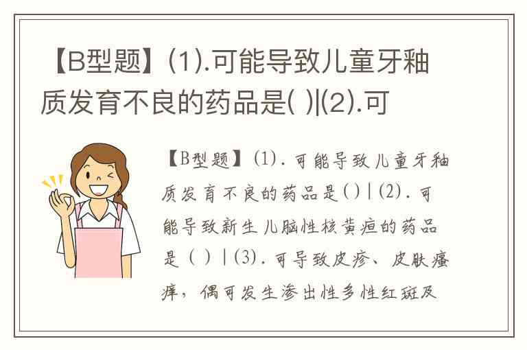 【B型题】(1).可能导致儿童牙釉质发育不良的药品是( )|(2).可能导致新生儿脑性核黄疸的药品是()|(3).可导致皮疹、皮肤瘙痒,偶可发生渗出性多性红斑及血管神经性水肿的药品是()|(4).可导致过敏性休克的药物是()A.磺胺类抗菌药 B.四环素类抗生素 C.氨基糖苷类抗生素 D.硝基呋喃类抗菌药