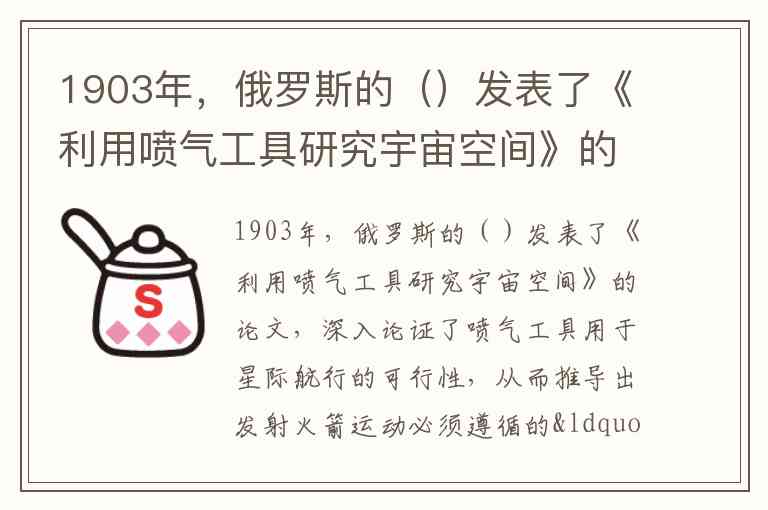 1903年,俄罗斯的()发表了《利用喷气工具研究宇宙空间》的论文,深入论证了喷气工具用于星际航行的可行性,从而推导出发射火箭运动必须遵循的“()”,他被尊为“()”。