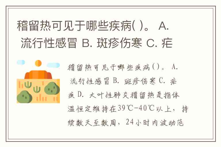 稽留热可见于哪些疾病( )。 A. 流行性感冒 B. 斑疹伤寒 C. 疟疾 D. 大叶性肺炎