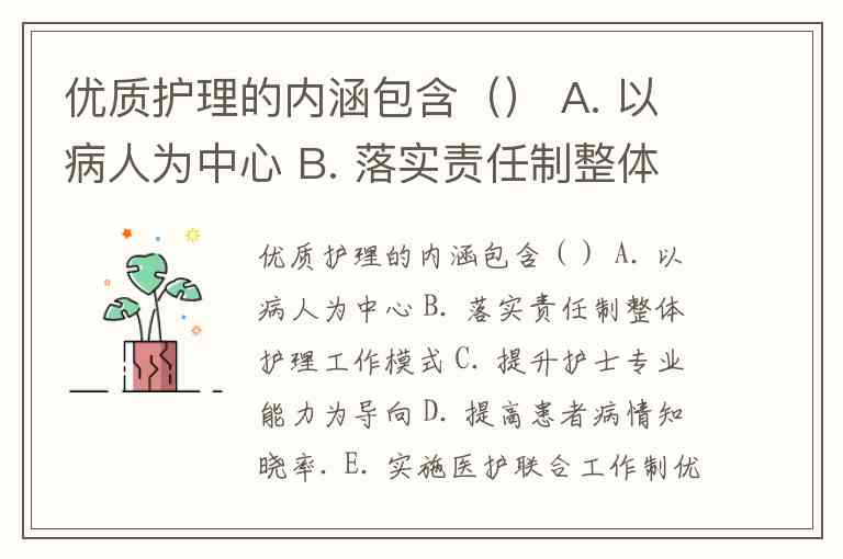 优质护理的内涵包含() A. 以病人为中心 B. 落实责任制整体护理工作模式 C. 提升护士专业能力为导向 D. 提高患者病情知晓率. E. 实施医护联合工作制