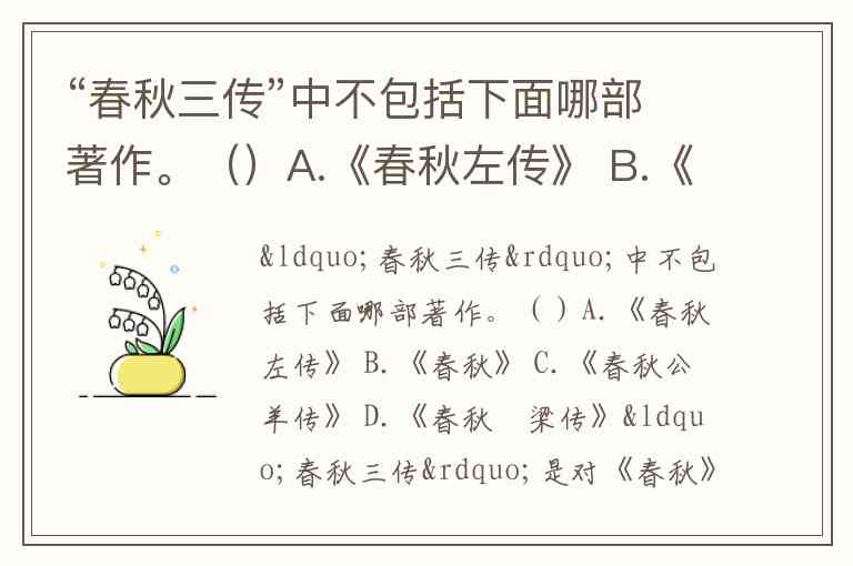 “春秋三传”中不包括下面哪部著作。()A.《春秋左传》 B.《春秋》 C.《春秋公羊传》 D.《春秋榖梁传》