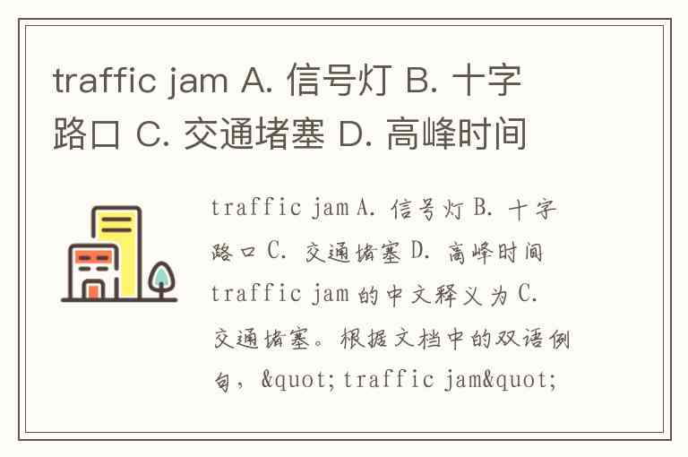 traffic jam A. 信号灯 B. 十字路口 C. 交通堵塞 D. 高峰时间