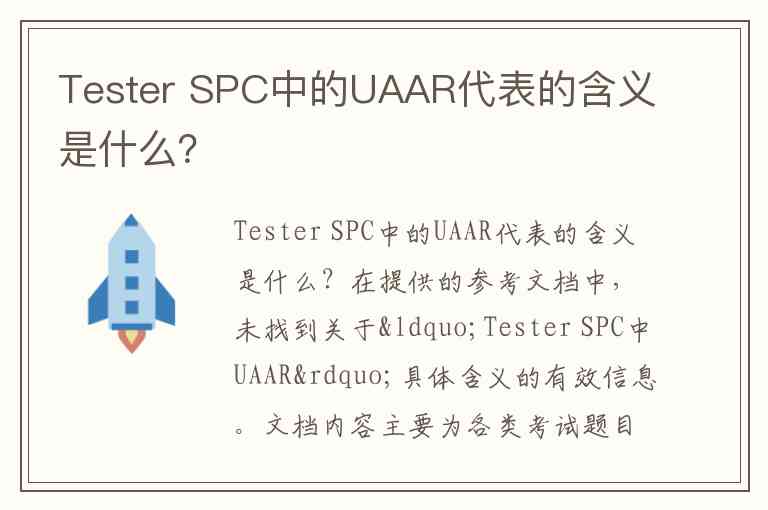 在提供的参考文档中,未找到关于“Tester SPC中UAAR”具体含义的有效信息。文档内容主要为各类考试题目及选项,如时区计算、历史制度、计算机操作等,未涉及SPC(统计过程控制)或测试领域中UAAR的相关解释。