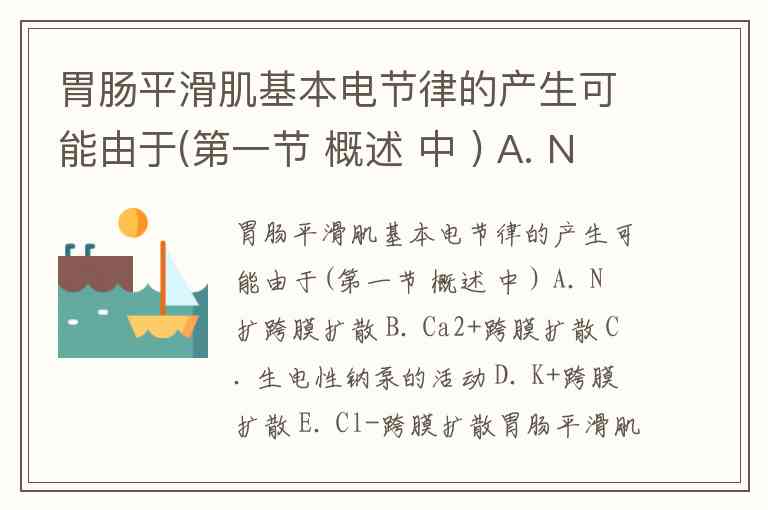 胃肠平滑肌基本电节律的产生可能由于(第一节 概述 中 ) A. N扩跨膜扩散 B. Ca2+跨膜扩散 C. 生电性钠泵的活动 D. K+跨膜扩散 E. Cl-跨膜扩散