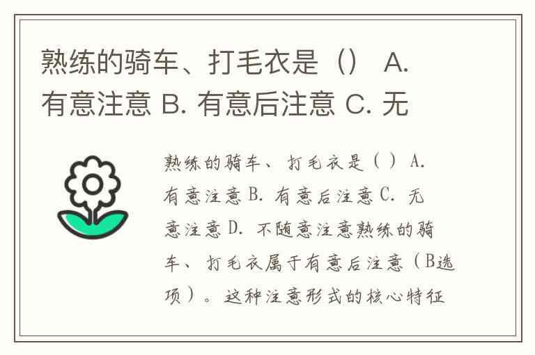 熟练的骑车、打毛衣是() A. 有意注意 B. 有意后注意 C. 无意注意 D. 不随意注意