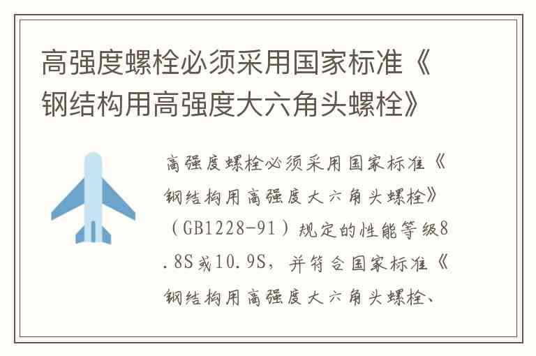 高强度螺栓必须采用国家标准《钢结构用高强度大六角头螺栓》(GB1228-91)规定的性能等级8.8S或10.9S,并符合国家标准《钢结构用高强度大六角头螺栓、大六角螺母、垫圈技术条件》(GB1231-91)。